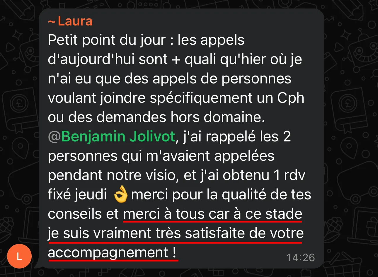 Laura : Plusieurs appels qualifiés chaque jours.